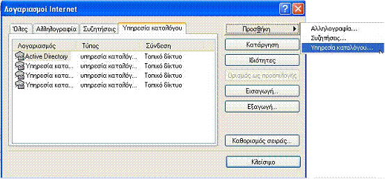 • Εμφανίζεται το παράθυρο Λογαριασμοί Internet και επιλέγουμε την καρτέλα «Υπηρεσία καταλόγου»